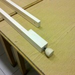 Miután a hátlaphoz ragasztottam és szögeltem a 2 hasábot ellenőrizni kell, hogy a lábak könnyen becsúsztathatóak-e. Ha nem akkor fa reszelővel és csiszolóvászonnal kell a távolságot bővíteni. Érdemes több lábbal is kipróbálni mivel a fenyőlécek nem pontosan egyformák.
