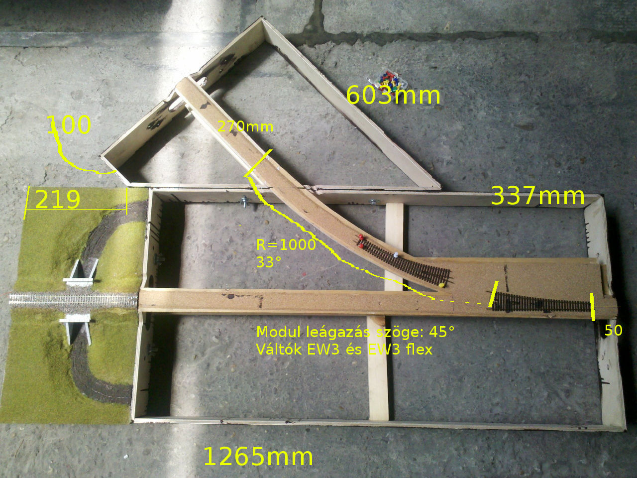A vágányrajz terveket Scarm programmal készítettem. Az ívek sugarát a helyszínrajzok alapján és az alkalmazott 0,5-ös torzítás alapján számítottam.